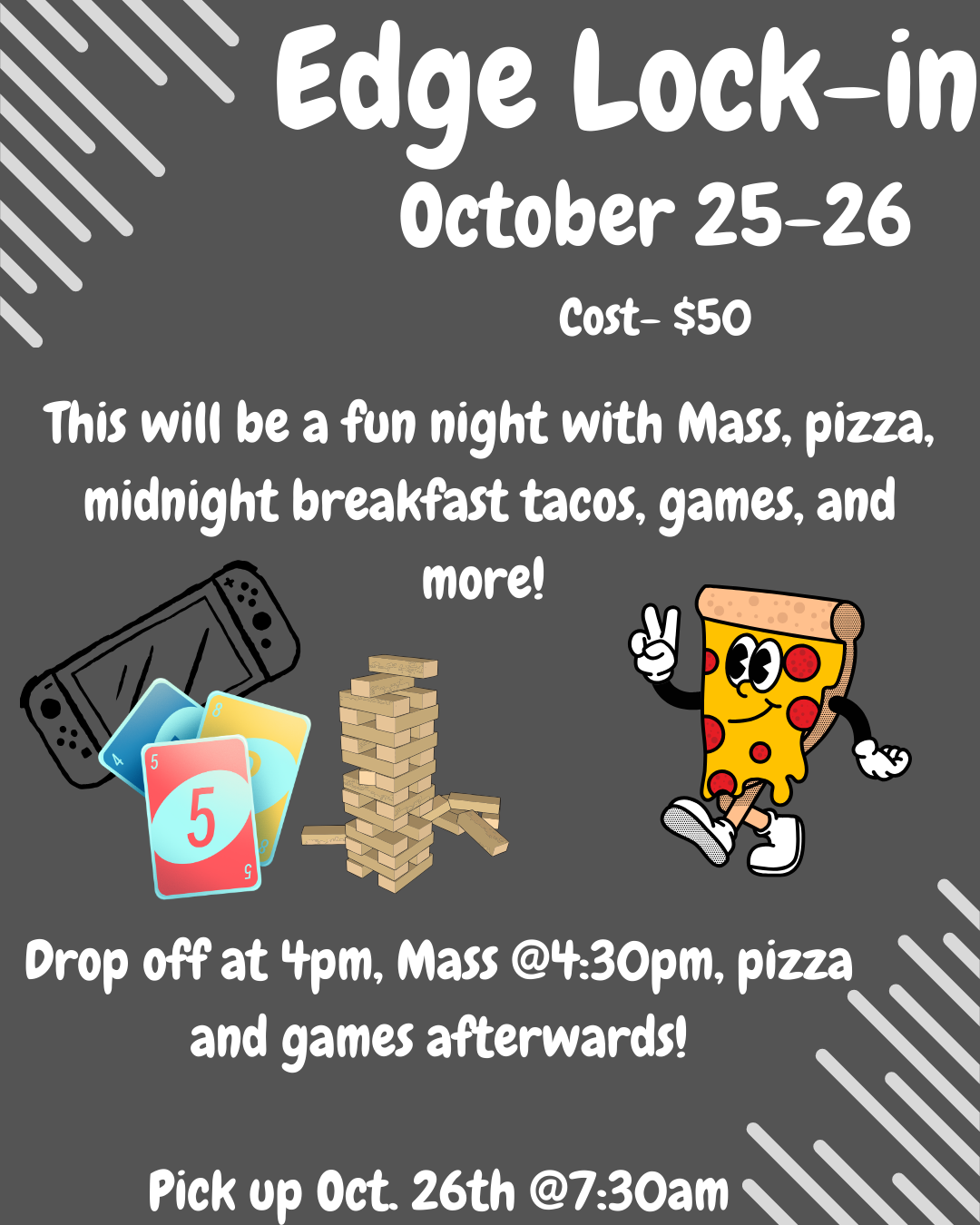 Drop off at 4pm, Mass @4:30pm, pizza and games afterwards!